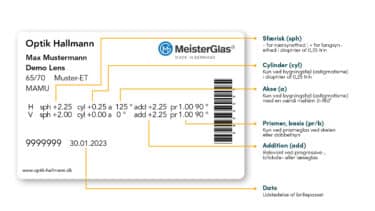 Herpå kan man se de præcise synsværdier, som vores Hallmann-optiker har målt ved tilpasningen af din brille (f.eks. værdierne fra synsprøven eller styrkerne på brillen). Med brillepasset kan din optiker hurtigt bestille en erstatning hvis du skulle have mistet, skadet eller har fået stjålet din brille.