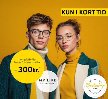 *Gyldig indtil den 26.11.2025. Alle tilbud indeholder en pakkepris for brillestel (fra MyLife kollektionen til en værdi af kr. 600,-) inkl. 2 brilleglas. Læse-/ afstandsbrilleglas indeks 1,5; inkl. hærdning og Superantirefleksbehandling ± 6 dpt./ -2 cyl. Progressive brilleglas indeks 1,5; inkl. hærdning og superantrefleksbehandling op til ±6 dpt./ -4 cyl. Kan ikke kombineres med andre kampagner/ kuponer. Alle priser er i DKK. Billede skabt med AI.